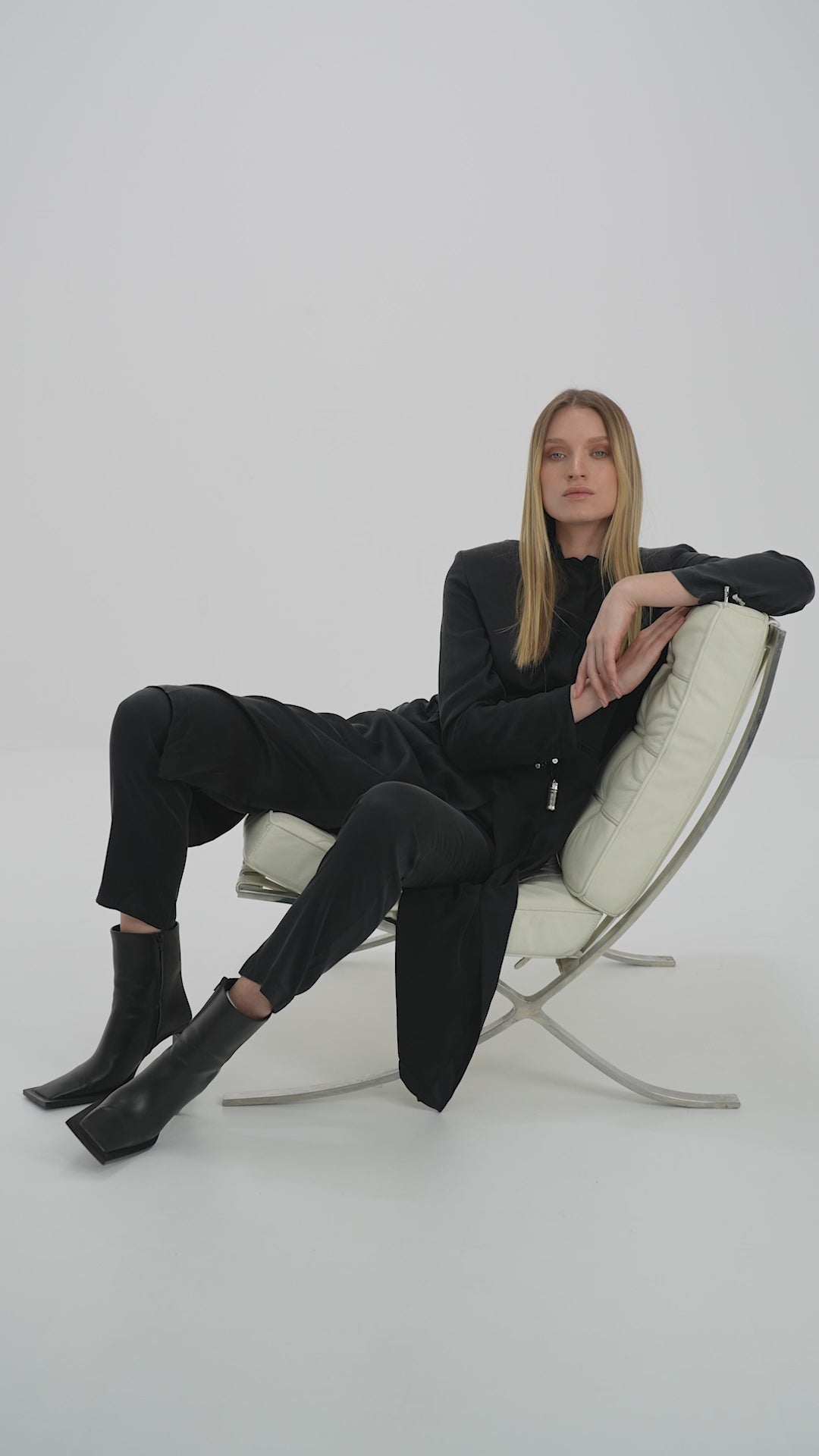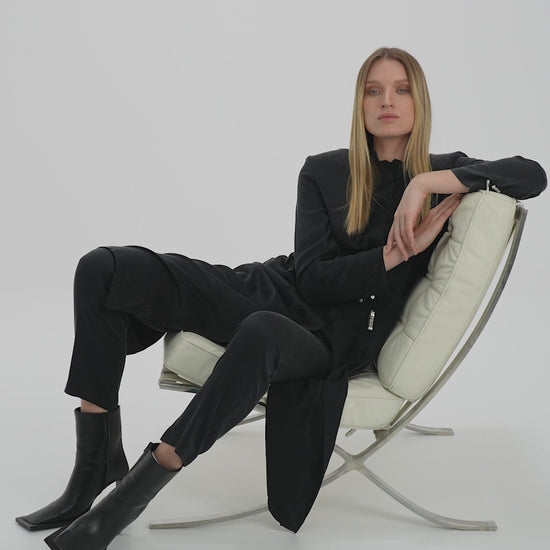 This semi-tailored jacket is made from soft stone-washed silk and features padded shoulders, a Chinese collar, and hidden shell buttons. The back slit can be worn open for drama or buttoned for a draped, rounded shape.
