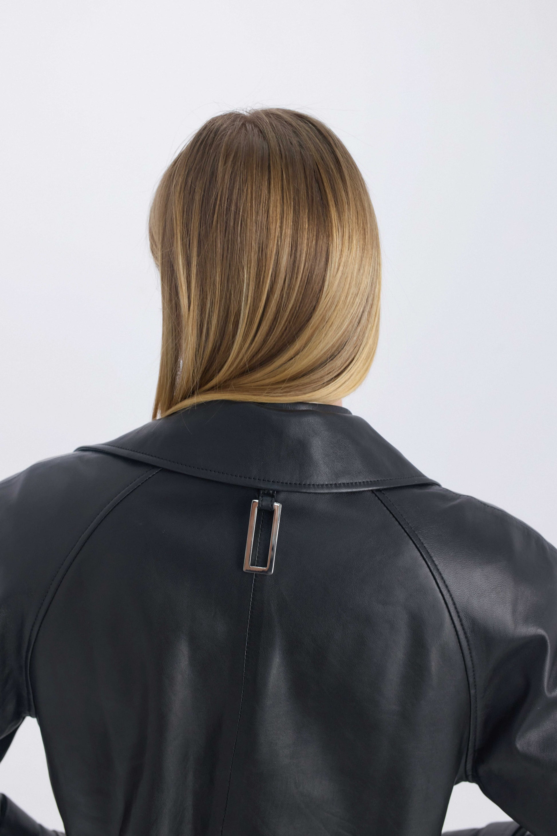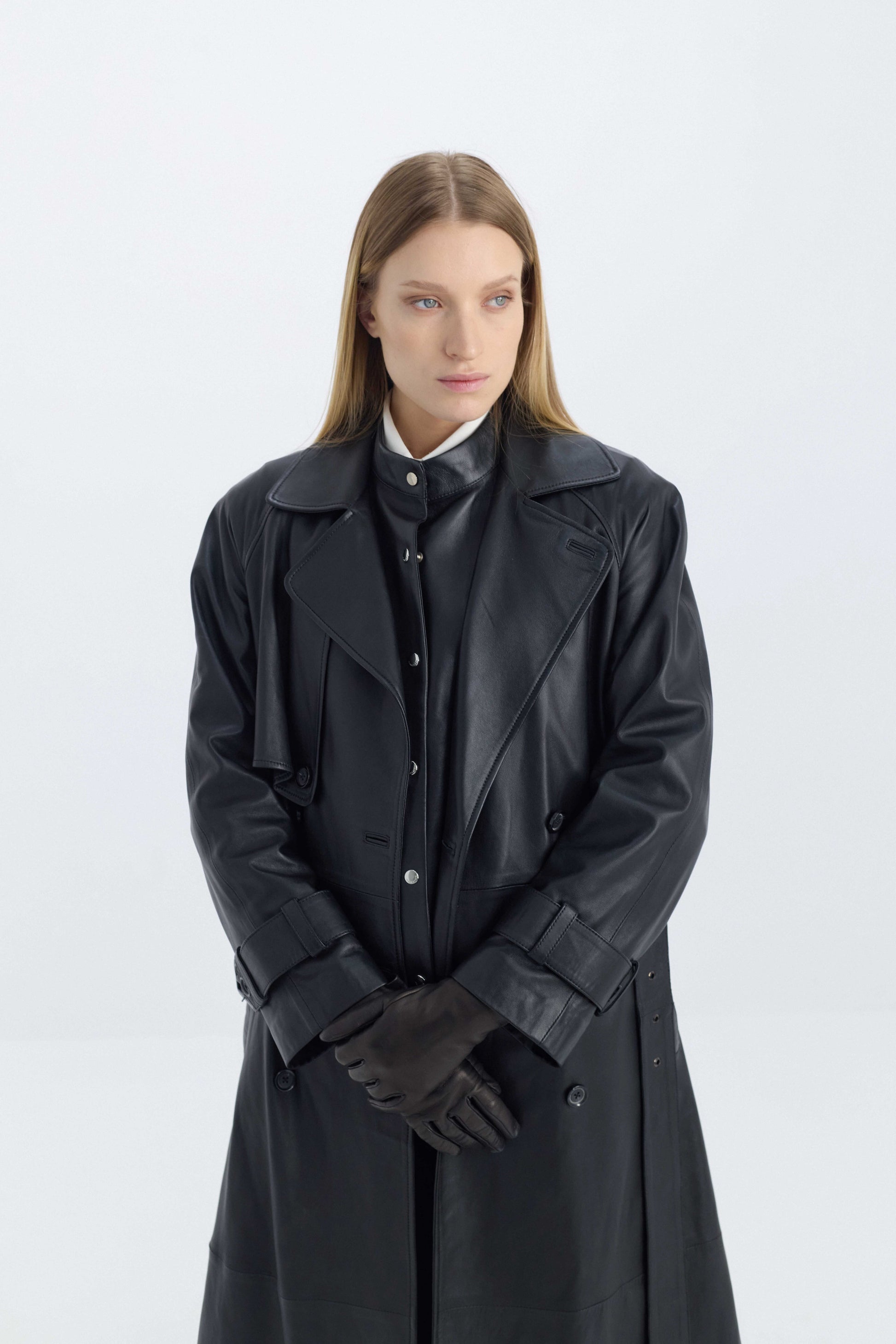 A meticulously crafted trench coat made from premium genuine leather. Designed for a tailored fit, it features precise paneling, refined stitching, and a structured silhouette that balances strength and elegance. Timeless and bold, this piece is built to last in both style and wear.